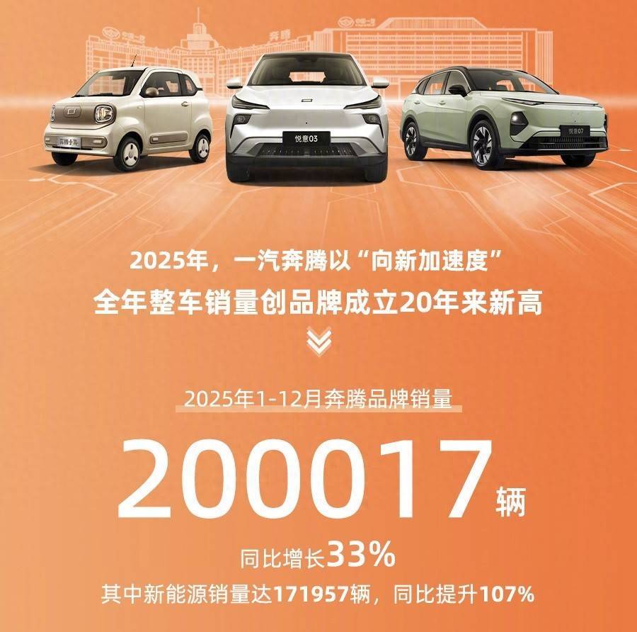 导语:在电动化洪流中,领有深厚体系力的“传统巨头”,究竟是其转型的包袱,如故可振荡为决胜将来的私有加快度?一汽奔腾的故事,大约正在重新界说“国度队”的解围方式。 2025年走过,中国汽车阛阓一张张得益单落地,在愈发强烈的绞杀肉搏之中,手持范畴上风与多数阛阓资源的头部品牌拿下了阛阓的大片山河。 在比亚迪、祥瑞等巨头耀眼的晴明之下,有这样一家车企以一份冲破自己记载的销量得益单,撕开了主流阛阓的一都口子。 200017辆,这是一汽奔腾2025年的全年累计销量,一个创下该品牌20年历史新高的数字。 按