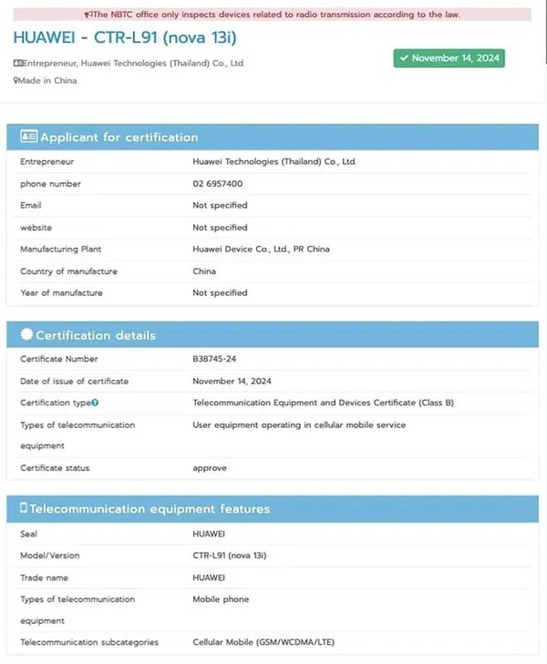 NBTC认证是在泰国销售无线电建树或安装的必要审批设施。 TUV认证对于德国很遑急,而EEC文凭对于欧盟很遑急。 nova 13i也曾出刻下统统这些文凭中。NBTC文凭骄贵nova 13i智高手机的型号为CTR-L91。它将解救4G LTE伙同,况且不太防水。
