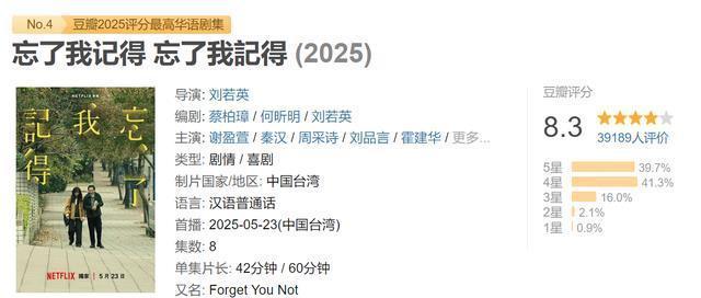 第四名:《忘了我谨记》 由谢盈萱,秦汉等主演的《忘了我谨记》赢得了第四名。 这部剧行为歌手兼演员的刘若英初度落寞执导的电视剧,这其中融入了她对人命阶段的感悟。