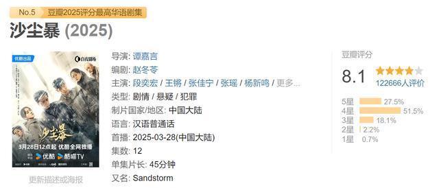 第五名:《沙尘暴》 由段奕宏,王锵,张佳宁等主演的《沙尘暴》赢得了第五名。 这部剧号称2025年口碑最佳的悬疑剧之一,毫无悬念。