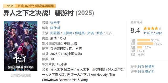 第二名:《异东谈主之下决战!碧游村》 由彭昱畅,王影璐,侯明昊等主演的《异东谈主之下决战!碧游村》赢得了第二名的佳绩。 行为《异东谈主之下》系列剧的续集,它不时了前作的热血与高燃打戏,并以仅有13集的体量,追求高信息量和电影感的叙事节律,是平台“短集数、高质地、强格调”计谋的代表作。