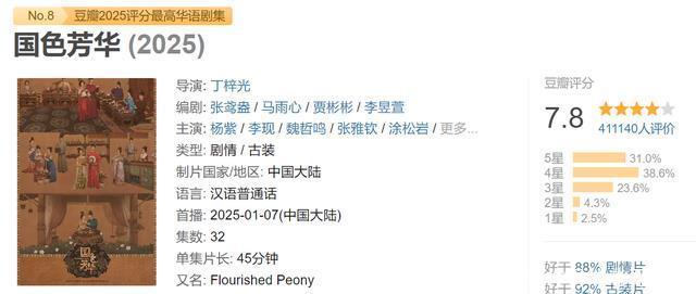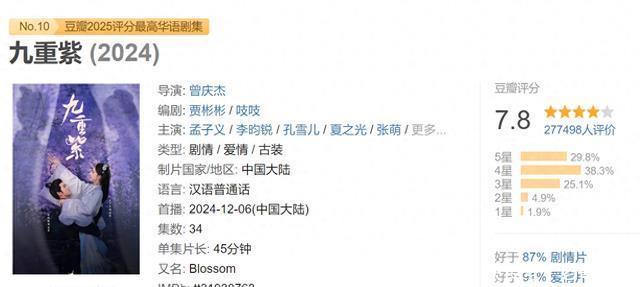 第十名:《九重紫》 孟子义亦然好起来了,由她和李昀锐主演的古装大剧《九重紫》以7.8的高分,荣获豆瓣2025年华语剧集评分第十名。