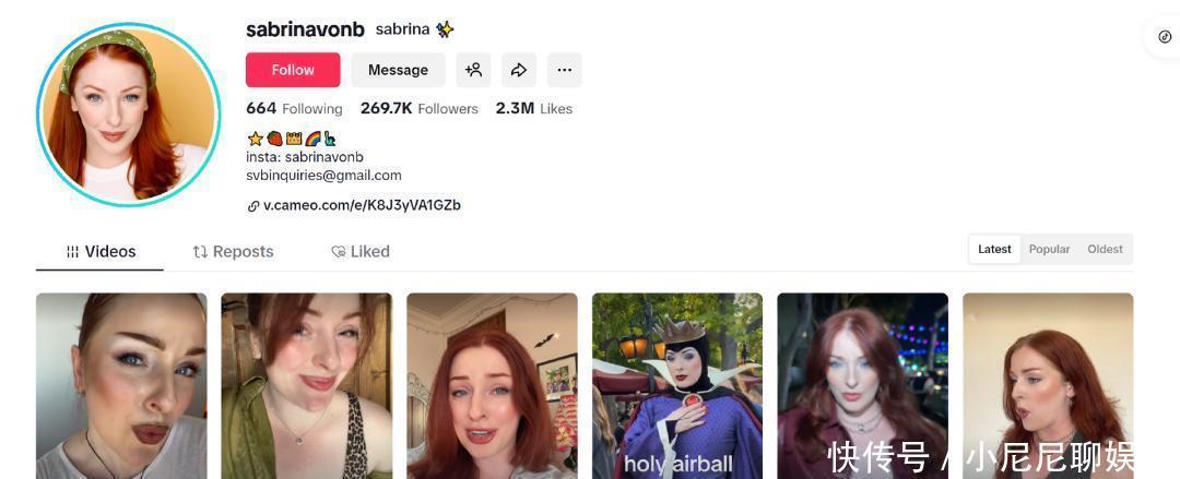 同期,Sabrina还发布了一条视频,公开了我方毒皇后饰演者的身份。此前,Sabrina的应酬账号里从未公开承认过我方饰演者的身份。她发的实际十足是对于一个平淡的27岁好意思国女孩的日常:购物,变装,去咖啡店。但如故被粉丝一眼认出,当今毒皇后饰演者的TikTok有26万粉丝。