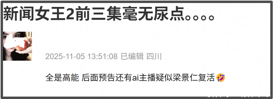 从告白数目和时长的数据不丢丑出平台和成本对《新闻女王2》很看好,从开播后不雅众的反馈来看,剧集的首播口碑并莫得亏负这份看好。