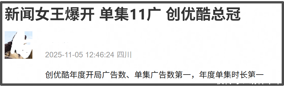 剧集首播等于爆开,从网友总结的数据中可以看到,除了总冠名除外,《新闻女王2》前三集告白多达11则,其中包括了5则片头告白、4则创意告白、一则中插告白和一则片尾告白。据悉,该剧的告白数目依然创下三个第一,分手是年度开局告白数第一、单集告白数第一和单集告白时长第一。