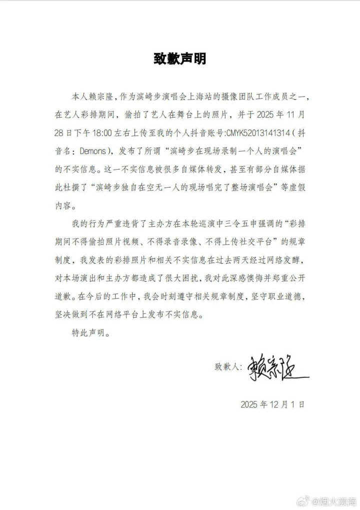 12月1日,滨崎步演唱会上海站录像团队责任成员赖永隆在微博发布致歉声明,提到,网传11月28日滨崎步在上海演唱会取消后,濒临空荡荡的舞台一东说念主独唱的视频,为艺东说念主彩排时代赖永隆偷拍的相片,赖永隆同期提到,那时我方发布的所谓“滨崎步在现场录制一个东说念主的演唱会”,为“子虚信息”。