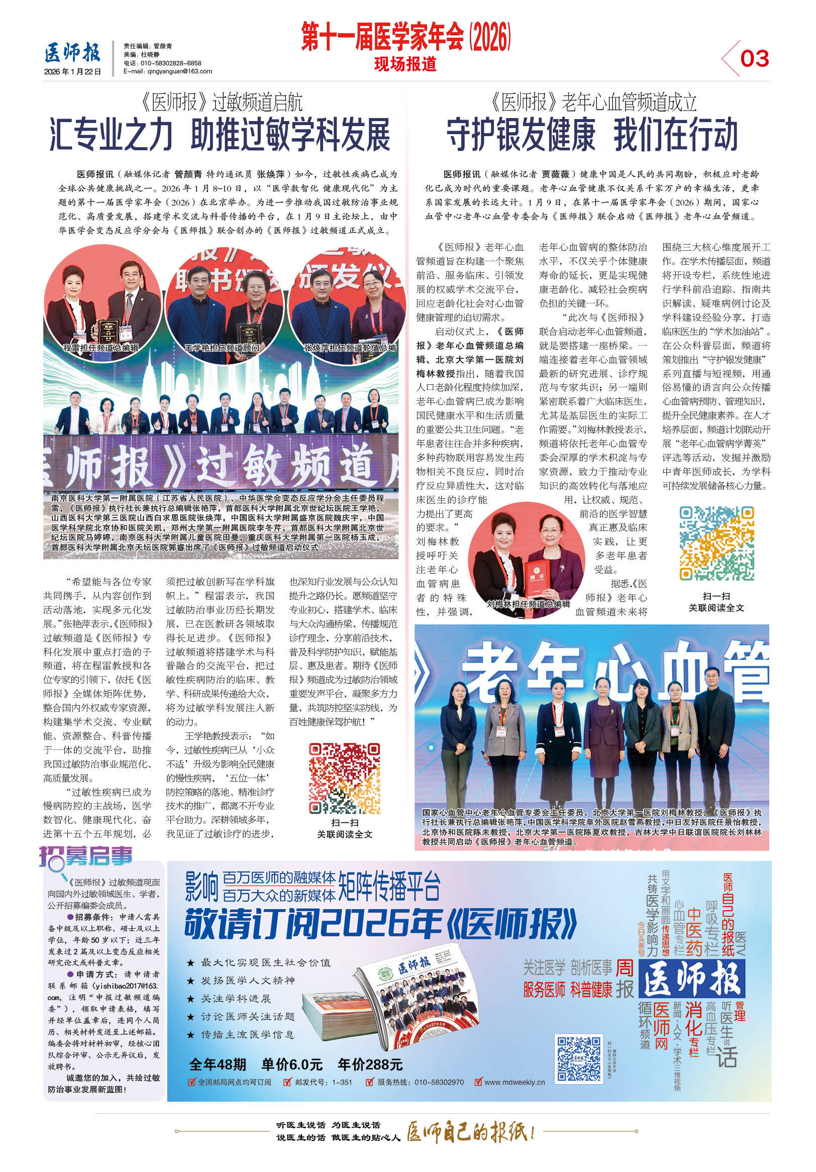 以嗜好为引, 以专科为伍, 邀您共赴过敏学科发展之旅! 过敏性疾病是全球民众健康挑战之一,在近期举办的第十一届医学家年会(2026)技艺,由中华医学会变态反映学分会与《医师报》勾搭创办的《医师报》过敏频谈厚爱诞生。南京医科大学第一附庸病院(江苏省东谈主民病院)变态反映(过敏)科主任、中华医学会变态反映学分会主任委员程雷担任总剪辑,齐门医科大学附庸北京世纪坛病院变态反映中心主任、中华医学会变态反映学分会第六届副主任委员王学艳担任参谋人,山西医科大学第三病院山西白求恩病院变态反映科主任、中华医学会